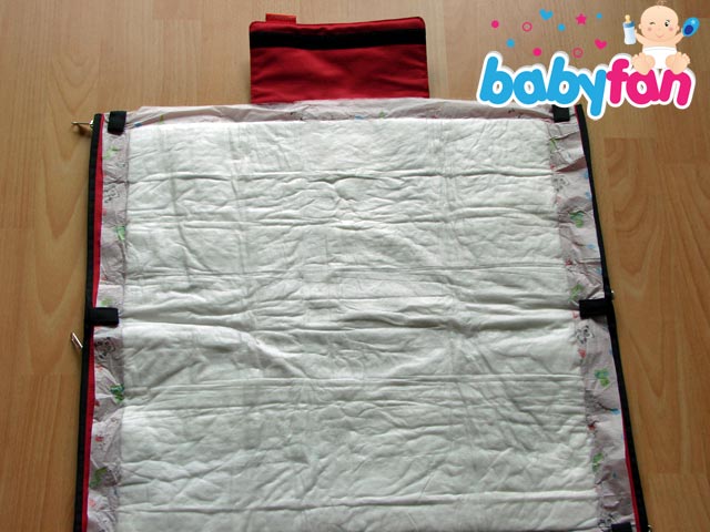 Der Wickeltisch ist eine Tasche, die man mit nur einer Hand auseinanderklappen kann. Voll auseinandergeklappt hat man die gleiche Größe (60×60 cm) wie bei einem herkömmlichen Wickeltisch. Das Baby wird dann auf eine Einweg-Wickelunterlage gelegt, die man sehr günstig im Handel, z.B. hier bei Amazon bestellen kann. Dadurch ergibt sich ein Maximum an Hygiene und Komfort. Der mobile Wickeltisch kann aber noch mehr.